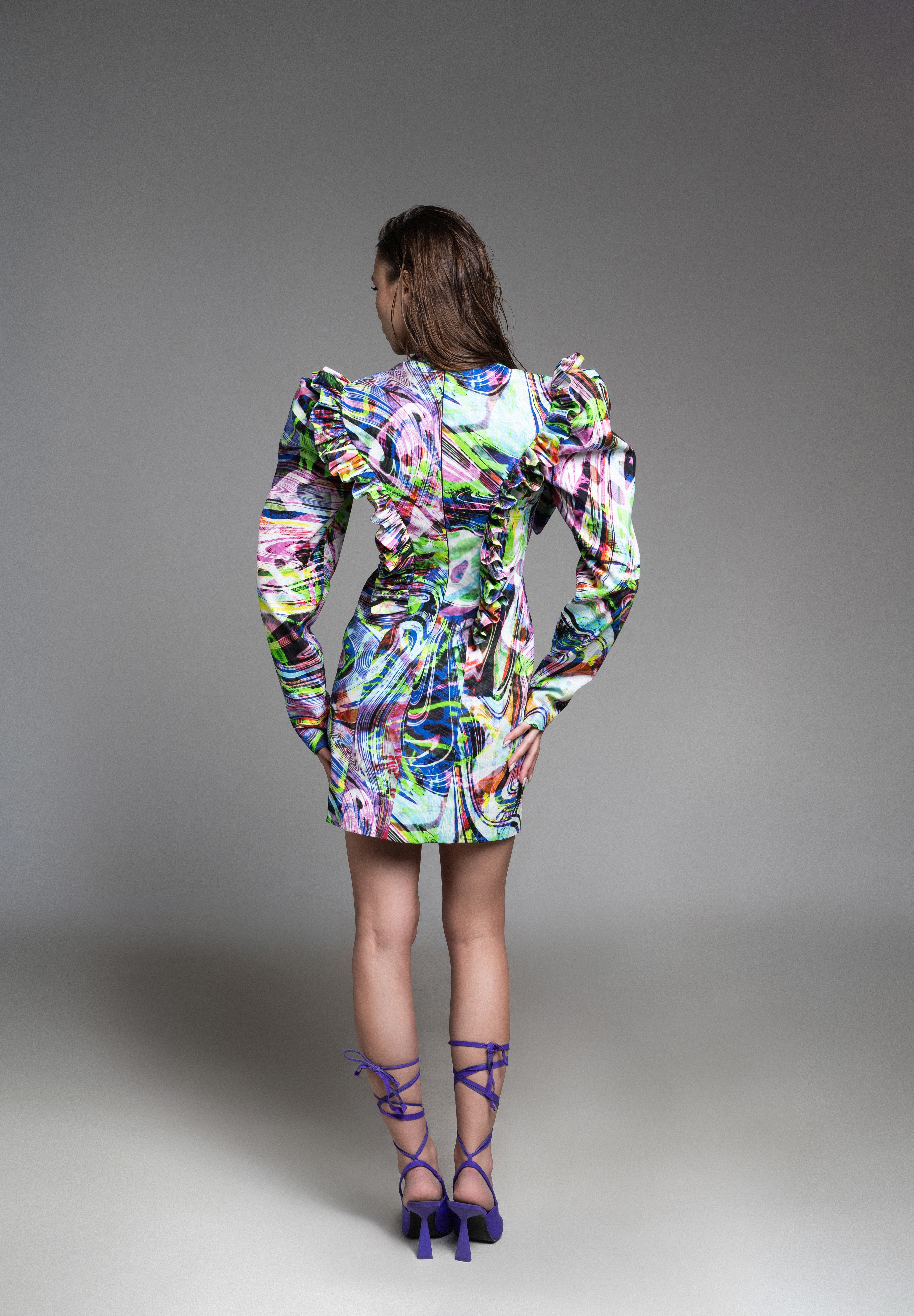 Angel Dress featuring dramatic, oversized ruffles on the shoulders and chest for an avant-garde touch. High neckline and long sleeves add sophistication, while the short hemline offers a playful contrast. Model wears size S (84/68/92).