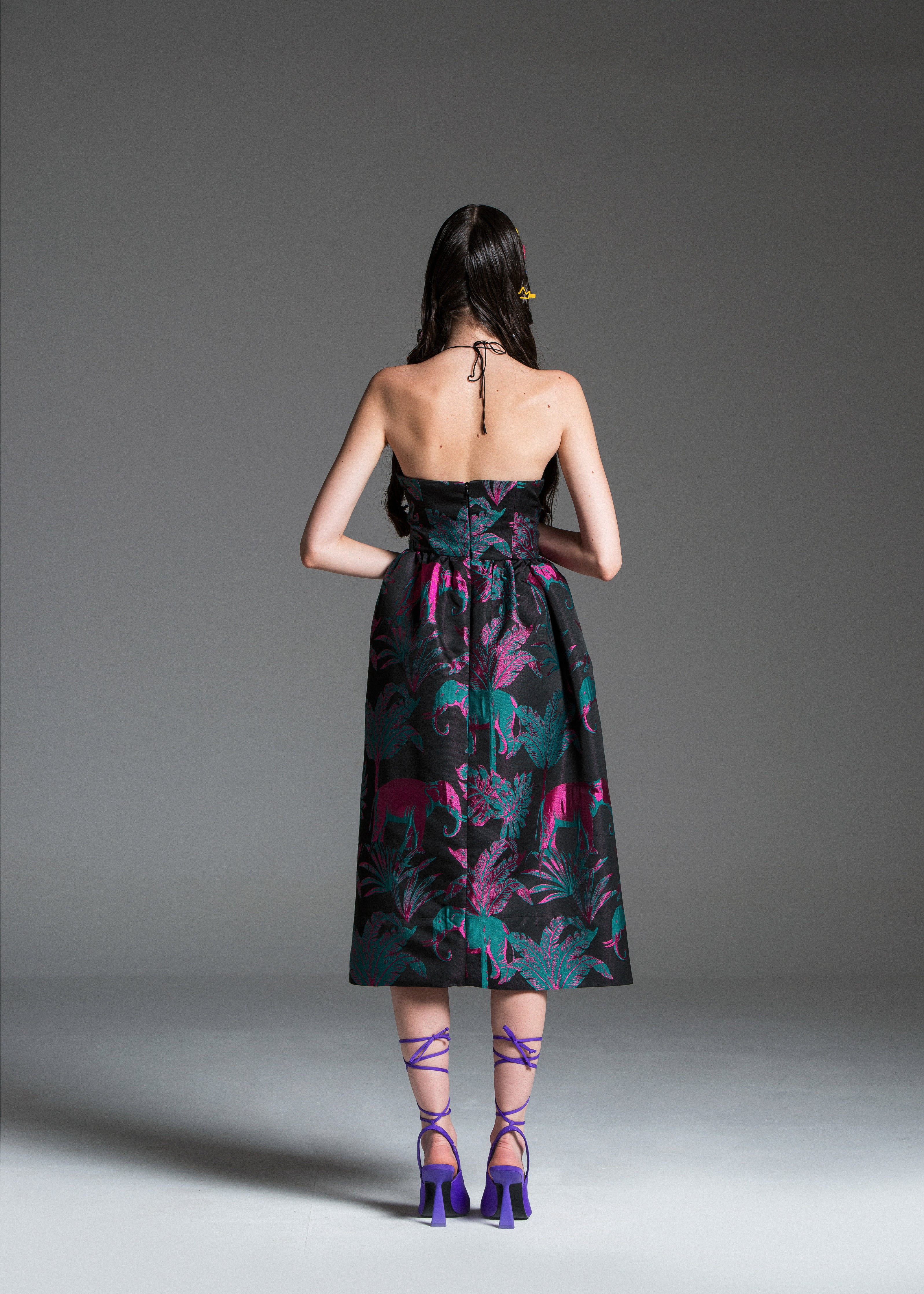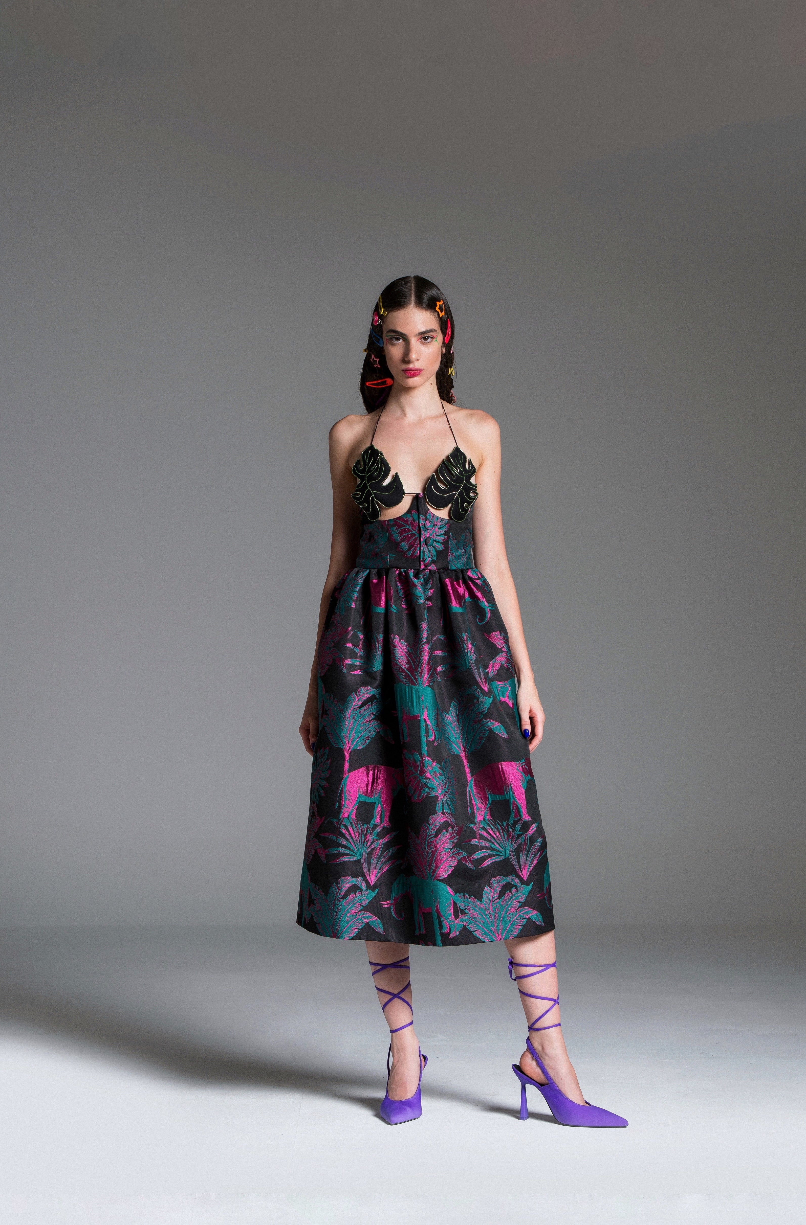Animal Skirt with a bold tropical foliage and animal print in shades of pink, turquoise, and black. High waist and gathered silhouette add movement and elegance. Model wears size S (84/68/92).