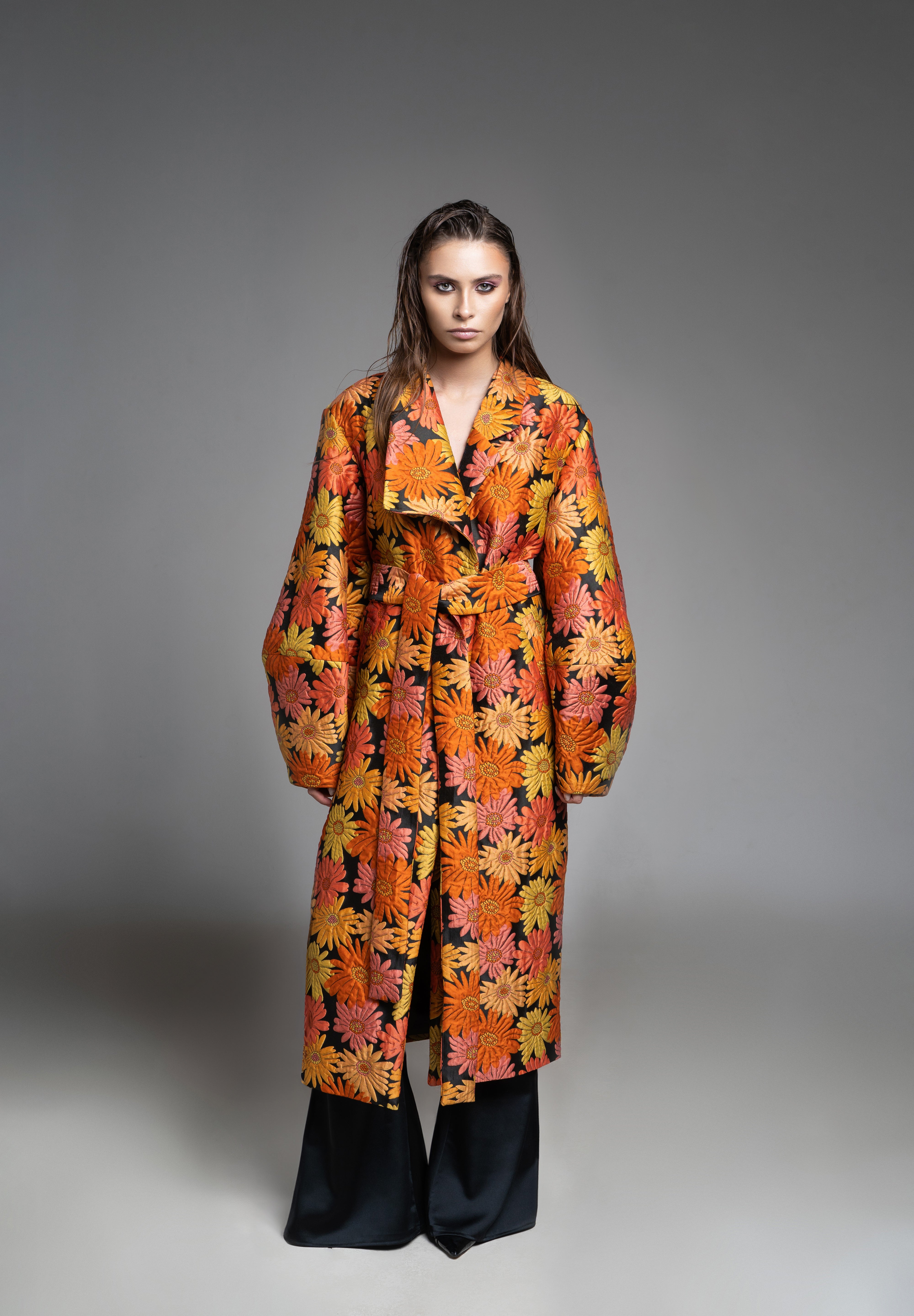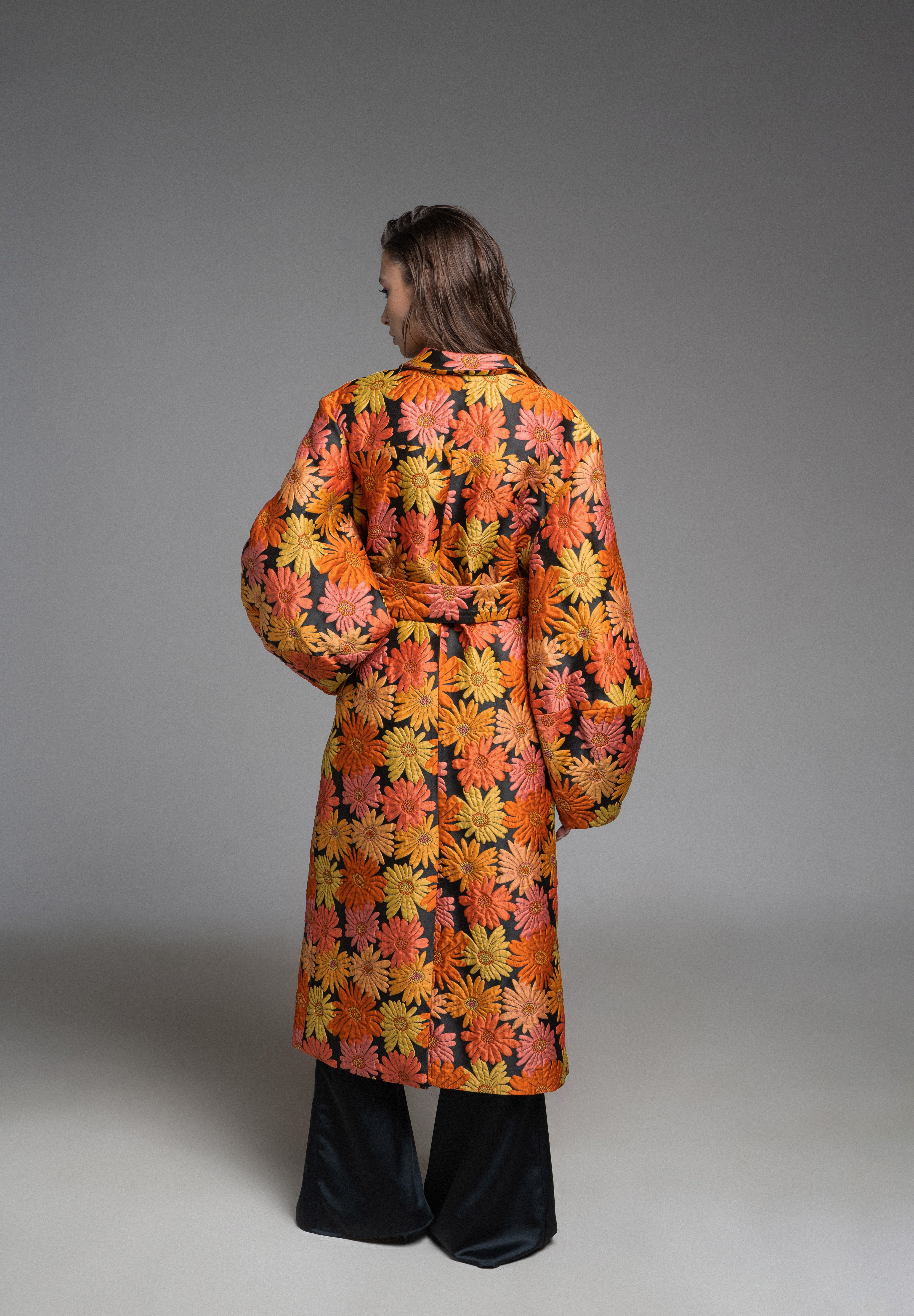 Balloon Coat with a lively orange floral pattern, cinched at the waist with a matching sash. Floor-length design with loose, oversized cut and billowy sleeves for a playful yet elegant look. Perfect for making a bold statement and adding a burst of colour to any outfit. Model wears size S (84/68/92).