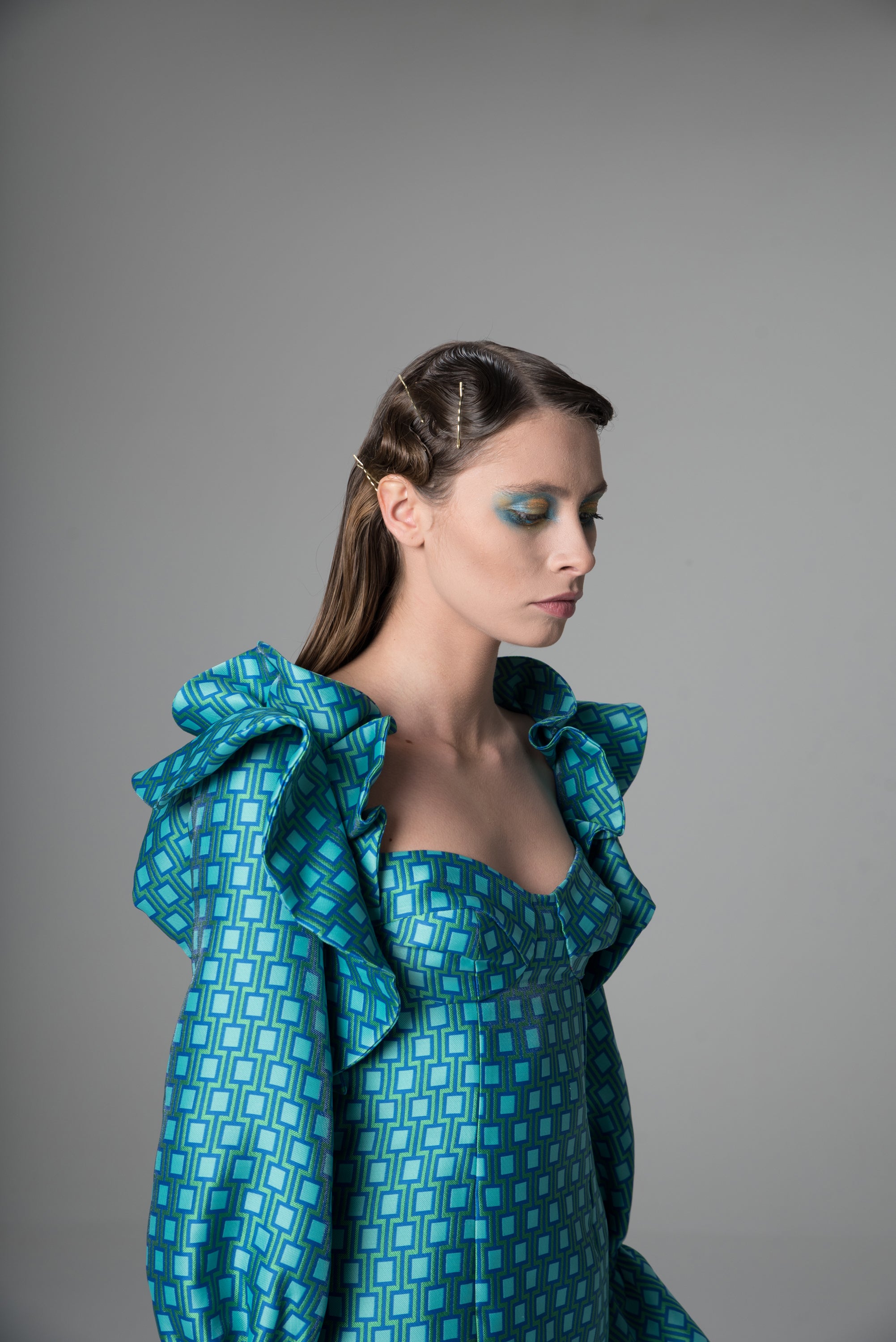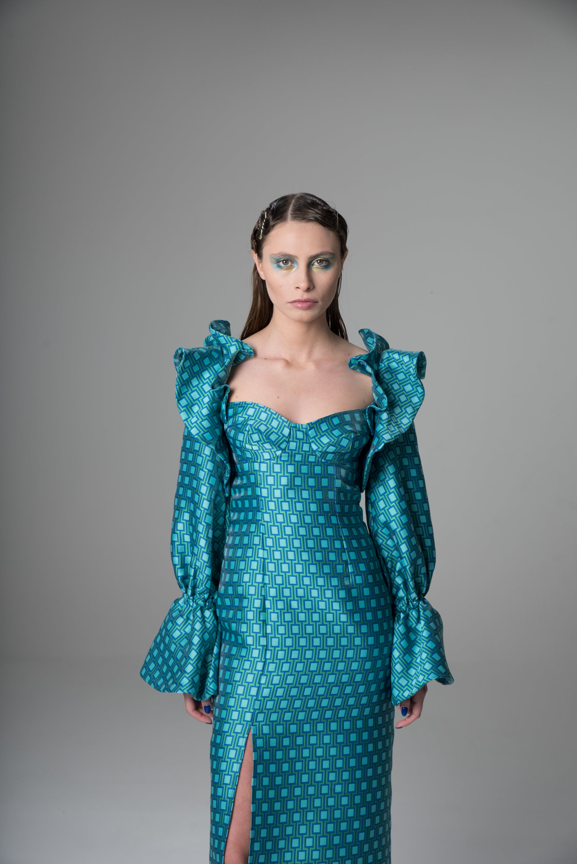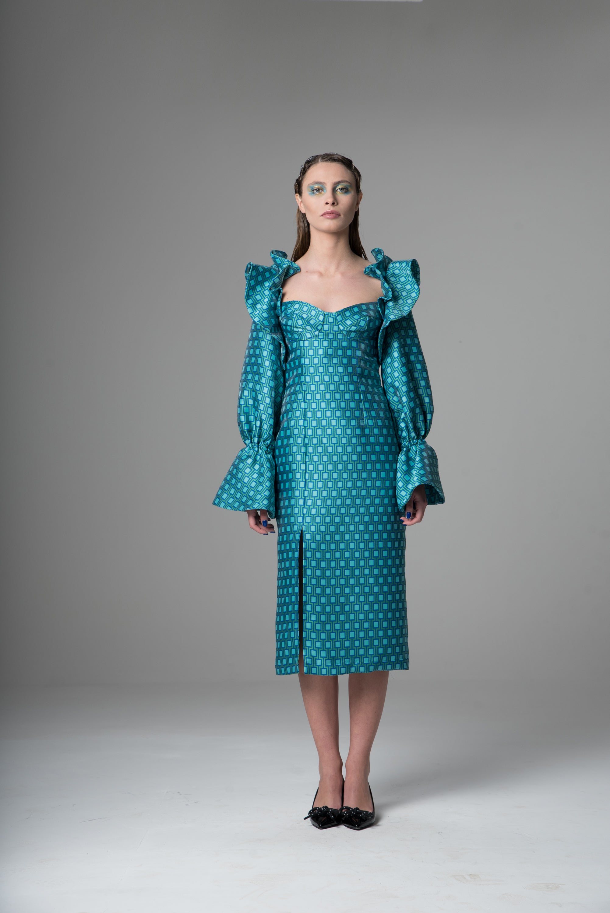 Stunning Blue Sunny Ruffle Dress. The vibrant blue midi corset dress features ruffled sleeves and a side slip, adding movement and elevating the look to a whole new level. Model wears size S (84/68/92).