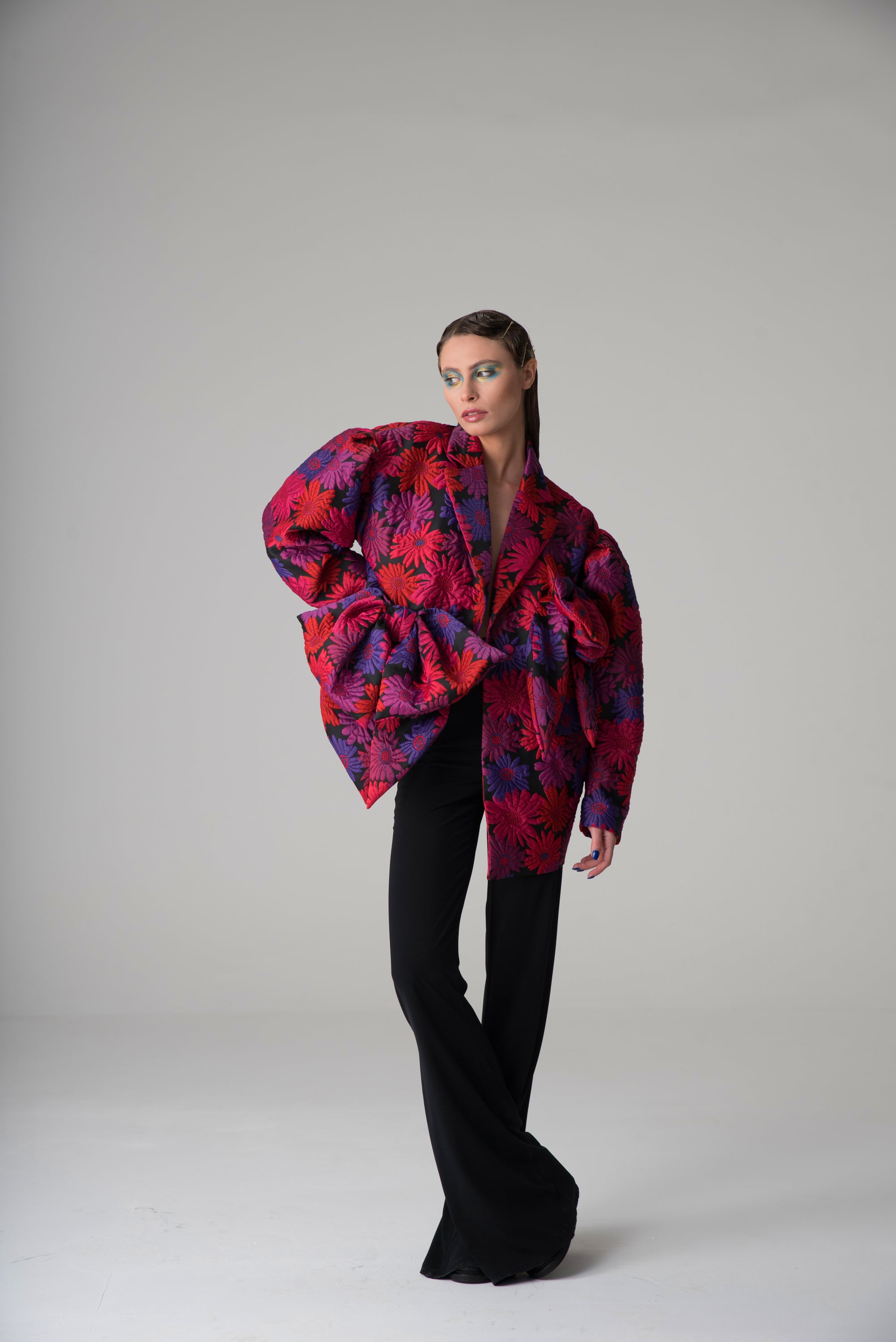 Bow jacket with stunning flower embroidery and eye catching bow accents on the front. Voluminous sleeves add an artistic touch, making it a captivating piece. Model wears size S (84/68/92).