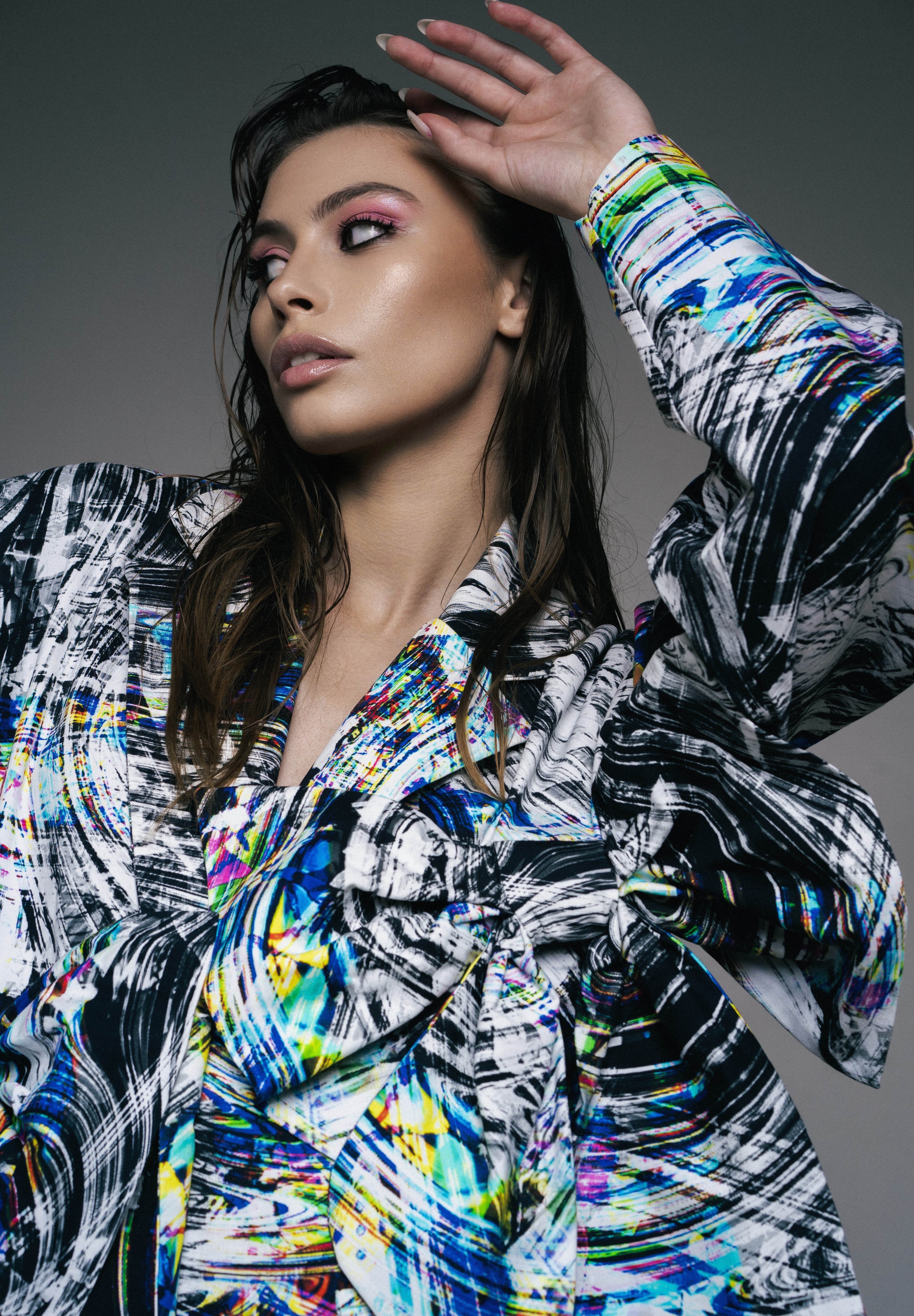 Bow Jacket with a captivating bow accent and voluminous sleeves, all in a striking psychedelic print. Designed to captivate with its irresistible charm, this jacket adds bold flair to any outfit. Model wears size S (84/68/92).