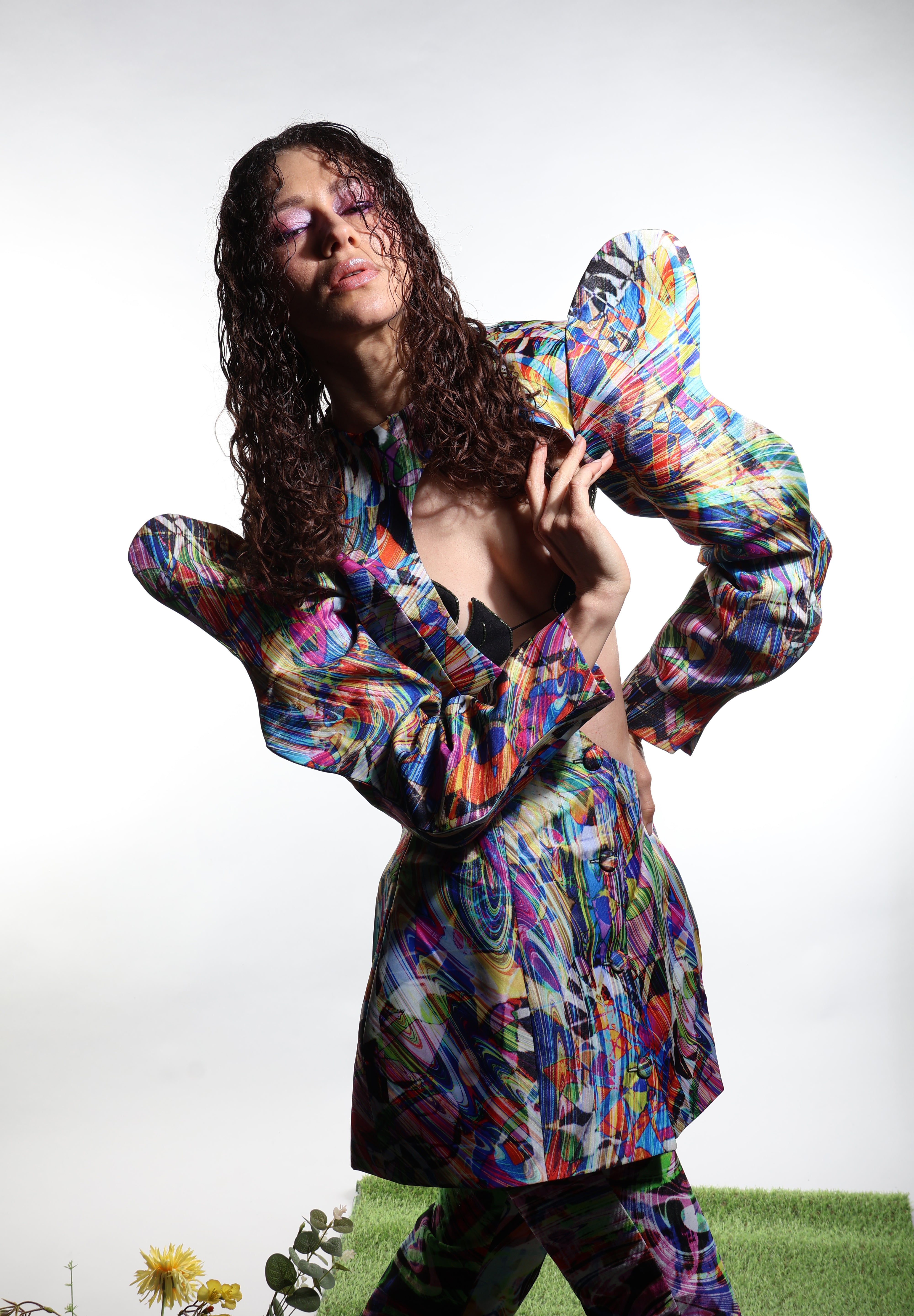 Butterfly Jacket with a tailored, fitted design and a unique heart-shaped cutout at the chest. The eye-catching pattern and sculptural, avant-garde sleeves make this piece a bold and must-have addition to your wardrobe. Model wears size S (84/68/92).