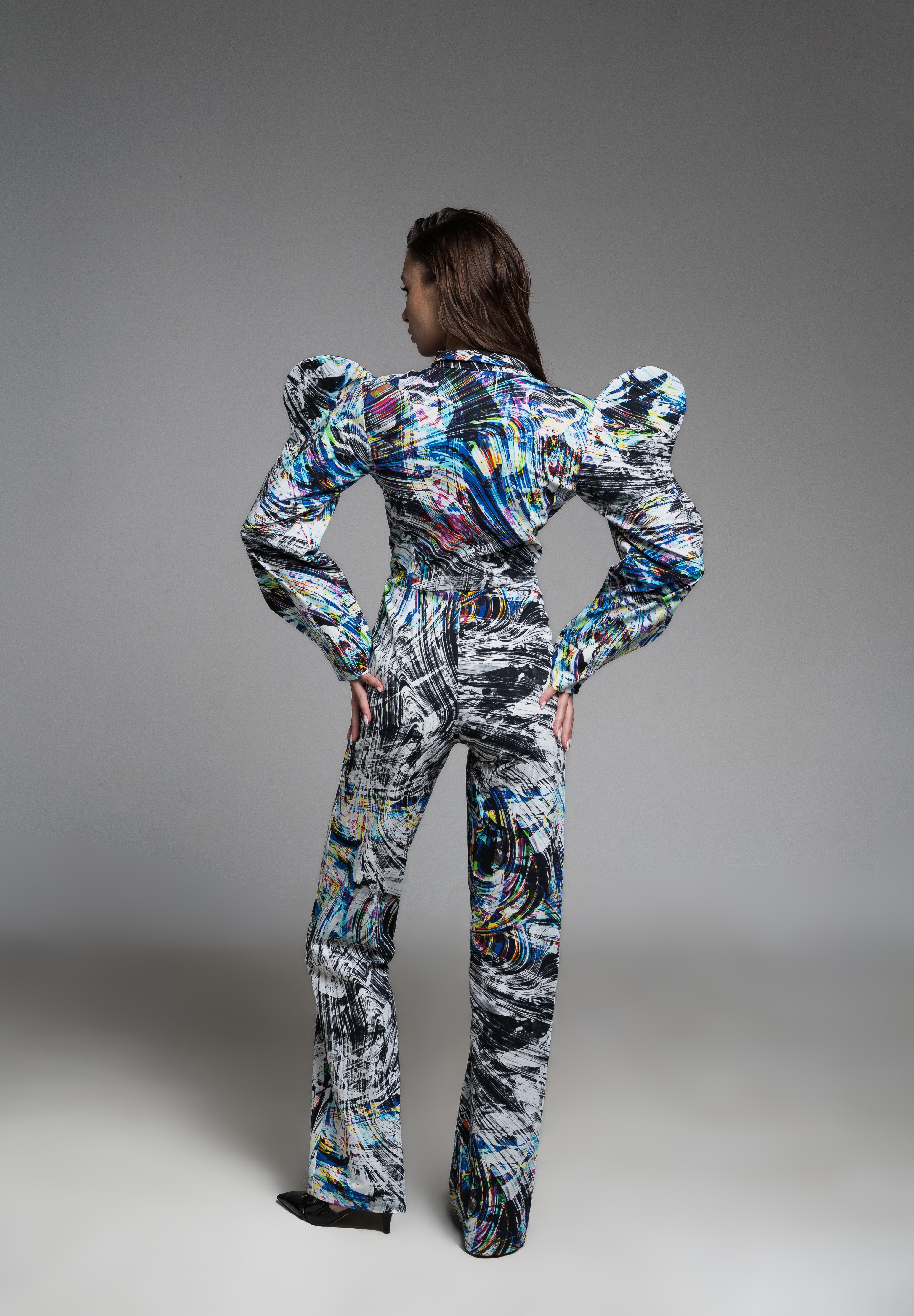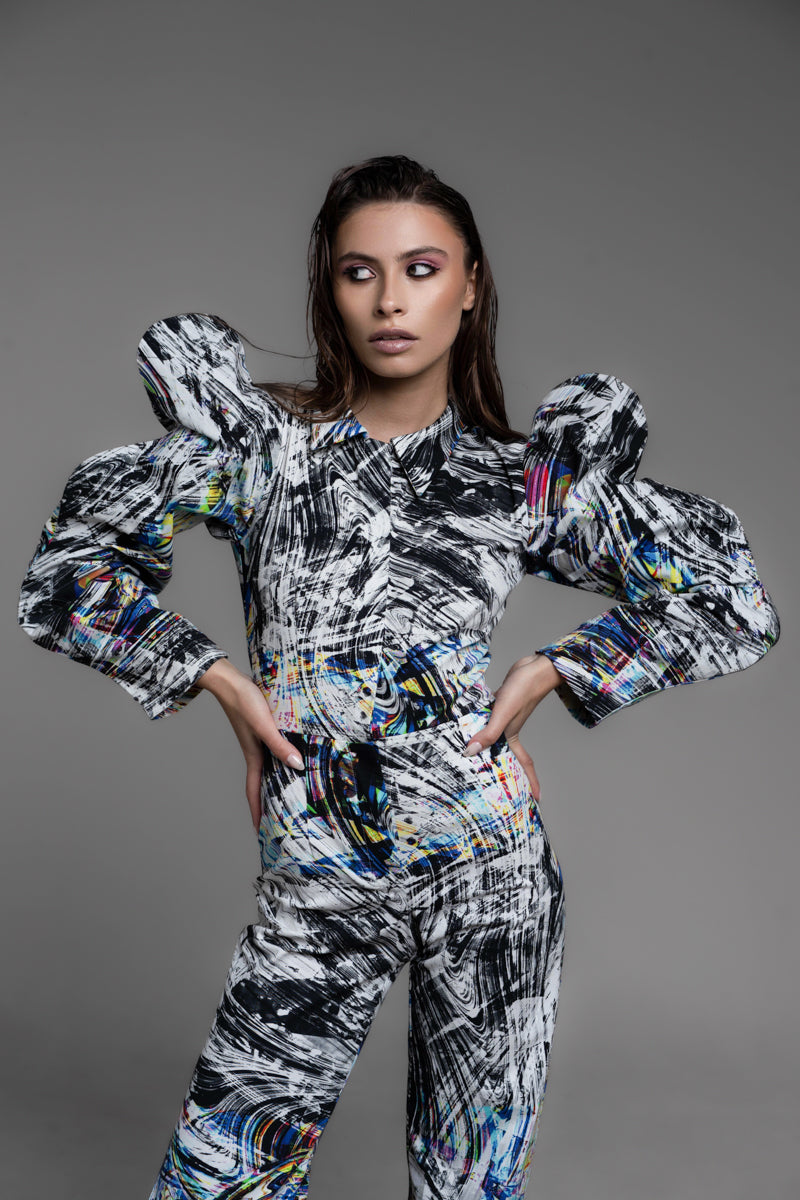 Abstract Patterned Jumpsuit with a striking mix of black, white, and vibrant colors. Designed with exaggerated puff sleeves and wide-leg pants for a chic, dramatic silhouette. Crafted from high-quality, lightweight fabric for comfort and style. Model wears size S (84/68/92).