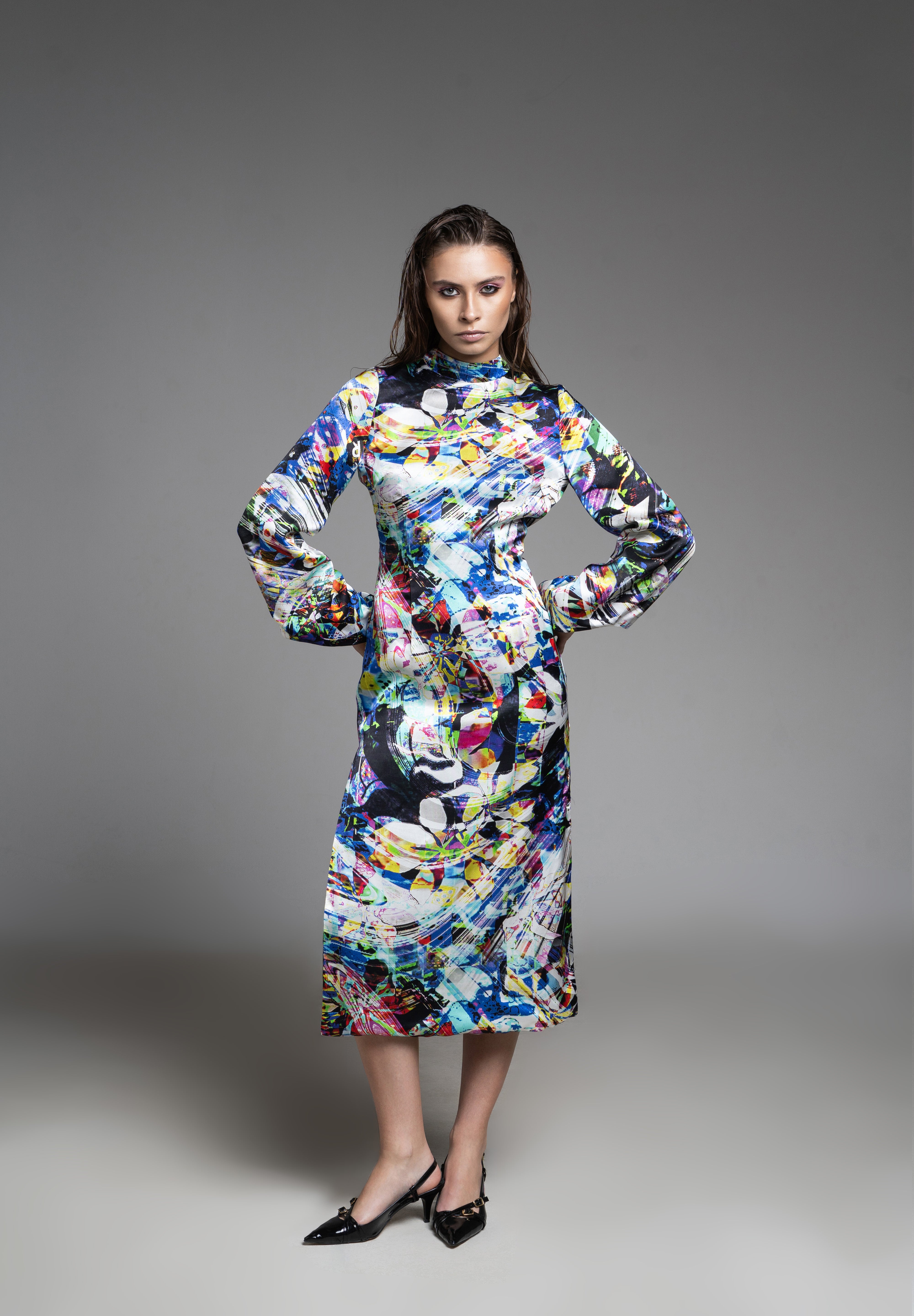Cleopatra Dress with luxurious crew neck, alluring back cutouts, and elegant side slits. Crafted from fine silk with a mesmerising psychedelic print. Model wears size S (84/68/92).