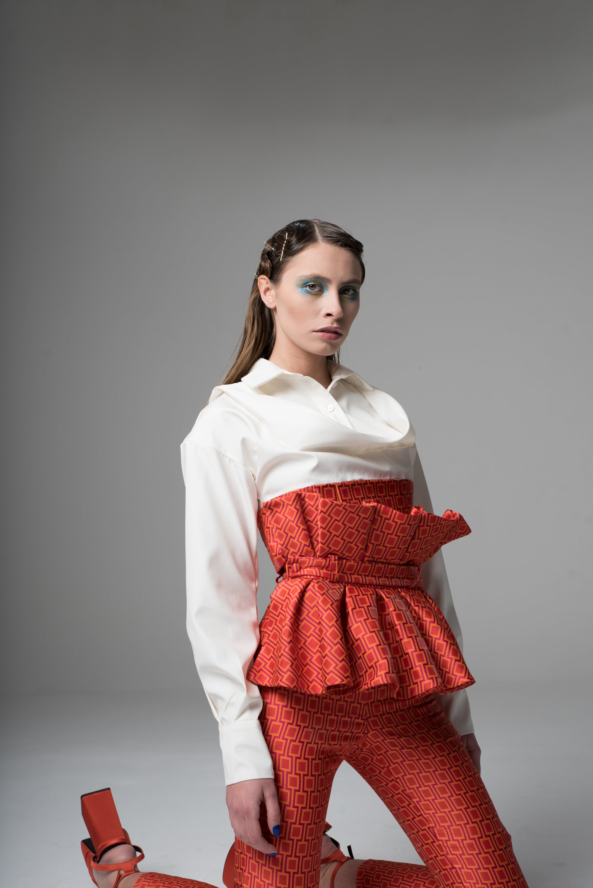 This white shirt showcases a combination of orange brocade fabric and a straight point collar with graceful draping on both sides. The bold straight point collar and distinct draping form a figure-flattering silhouette that enhances your appearance. Model wears size S (84/68/92).