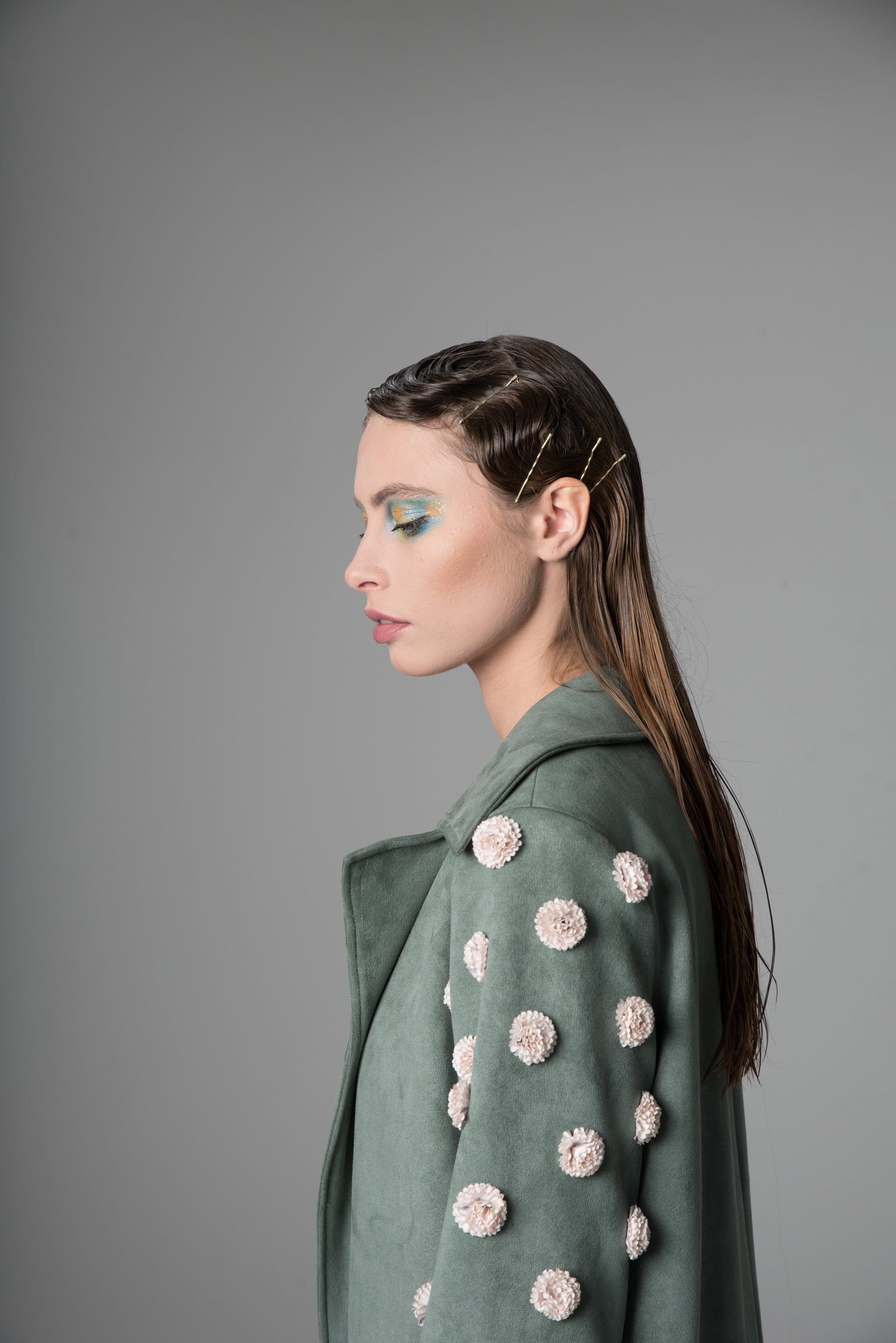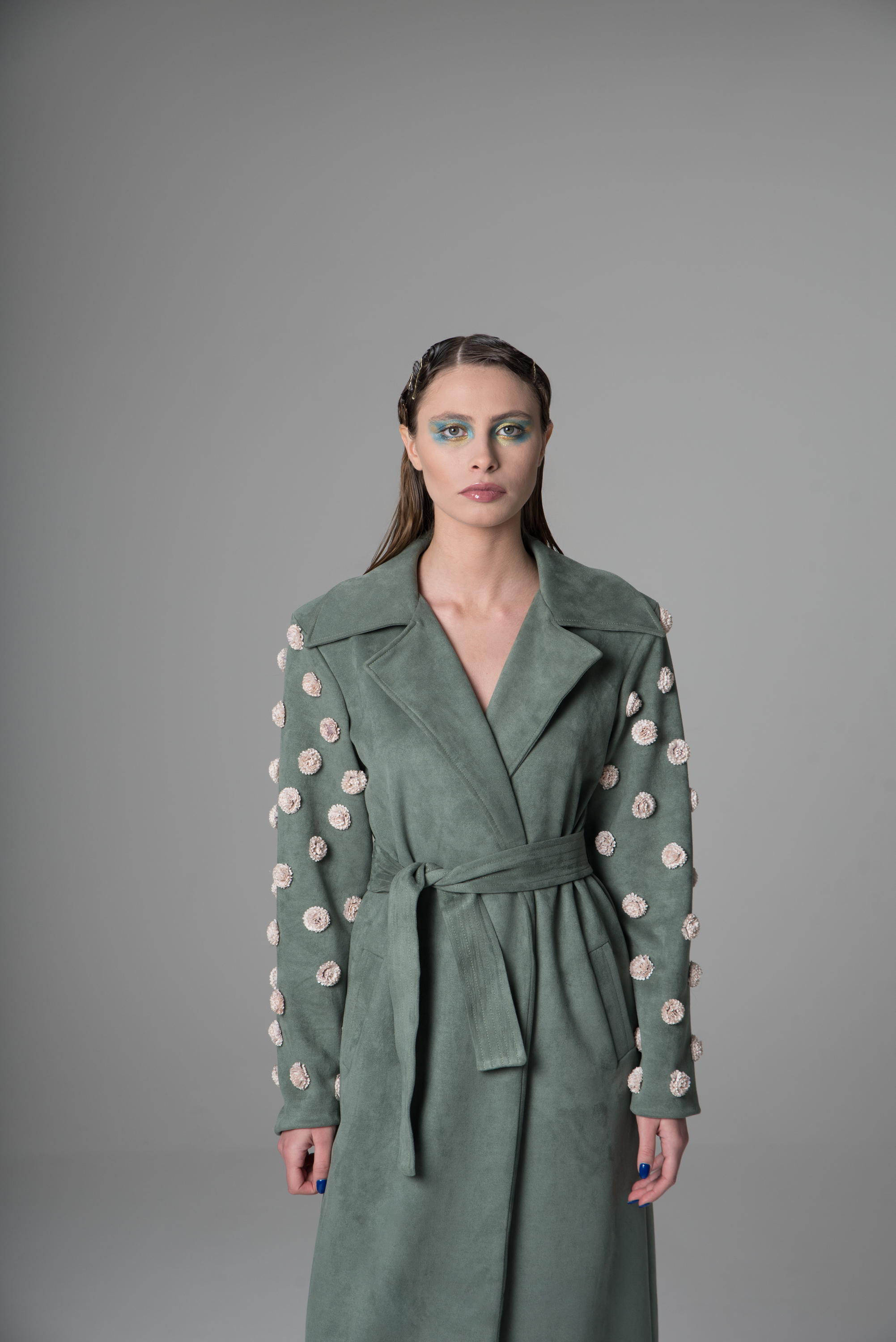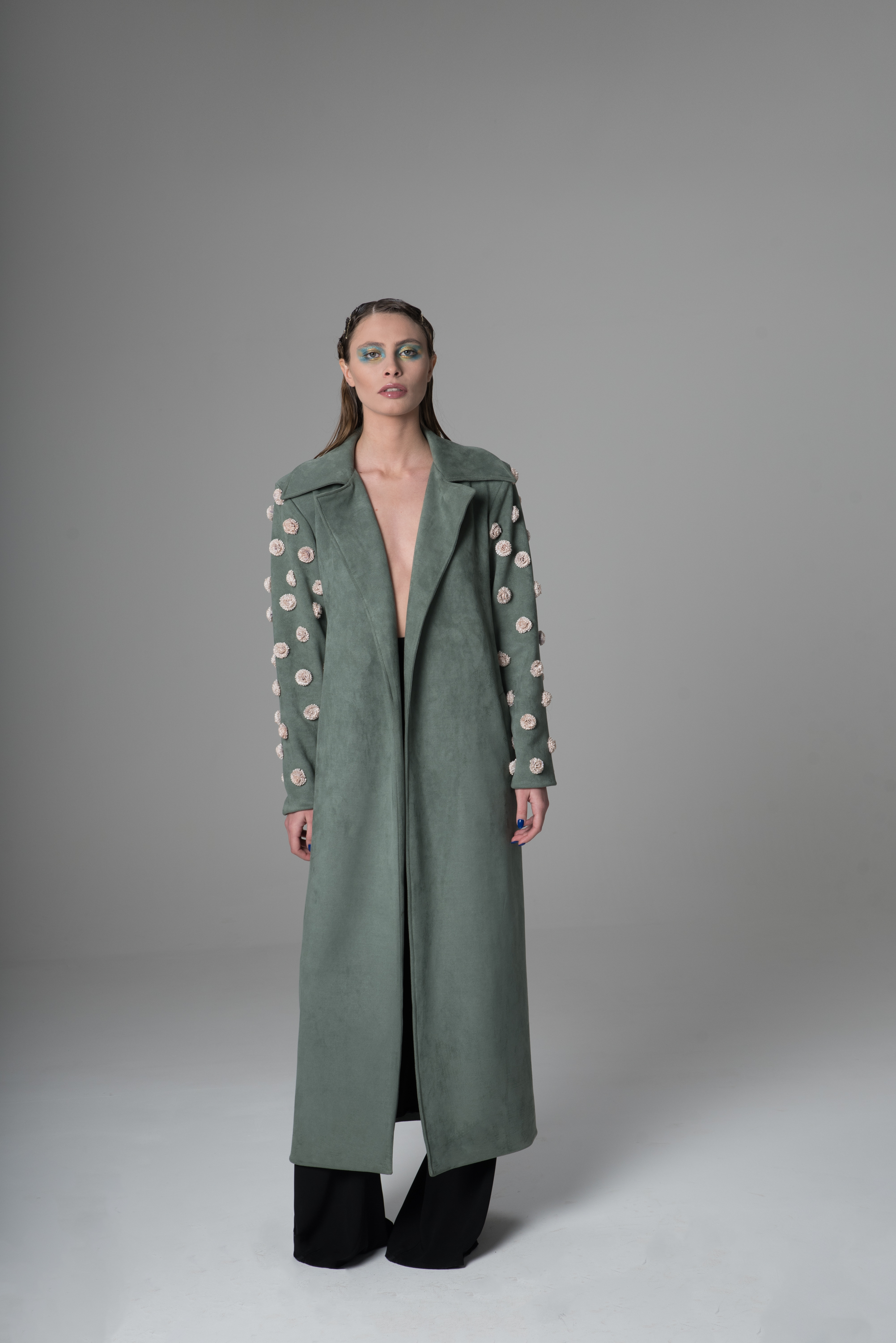 Upgrade your coat collection with this sophisticated green long coat made from luxurious fabric. Featuring delicate faux floral appliqués on the sleeves, this coat adds a touch of charm and femininity. The sleek design with a deep neckline offers versatile styling options, perfect for formal attire or elevating casual outfits. Expertly tailored for a refined look. Model wears size S (84/68/92).