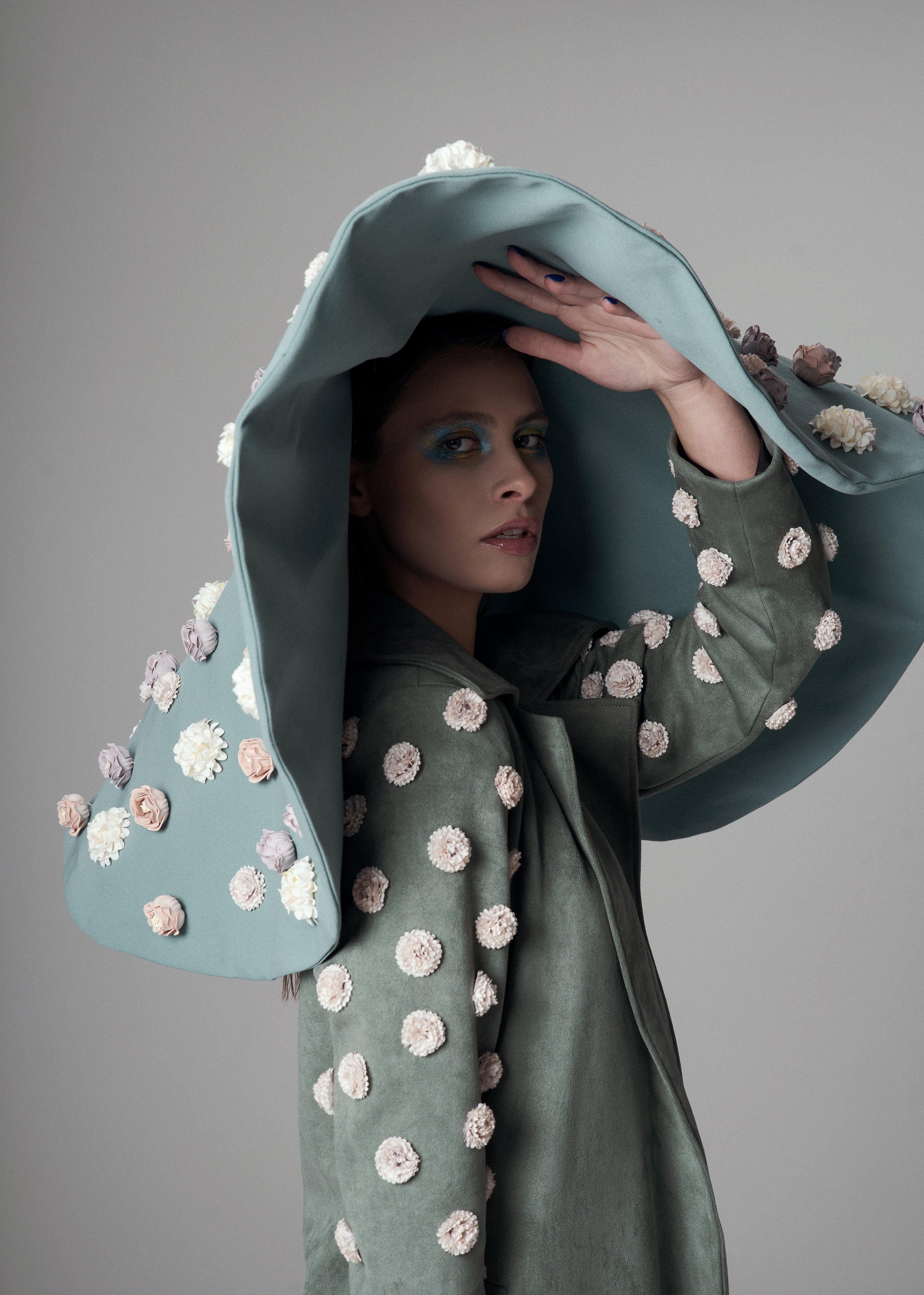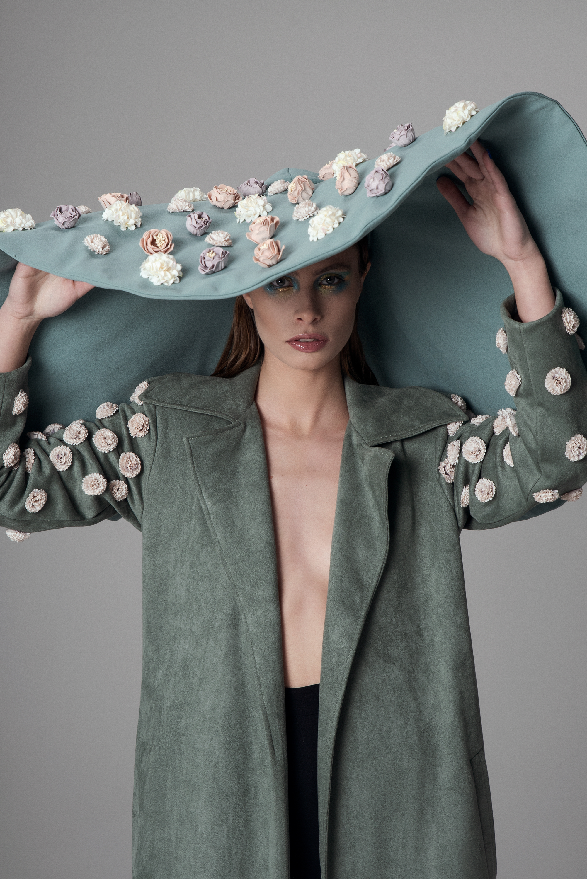 Step into bold fashion with this oversized hat, adorned with faux flowers for a whimsical, artistic flair. Perfect for editorials and photo shoots. Model wears size S.