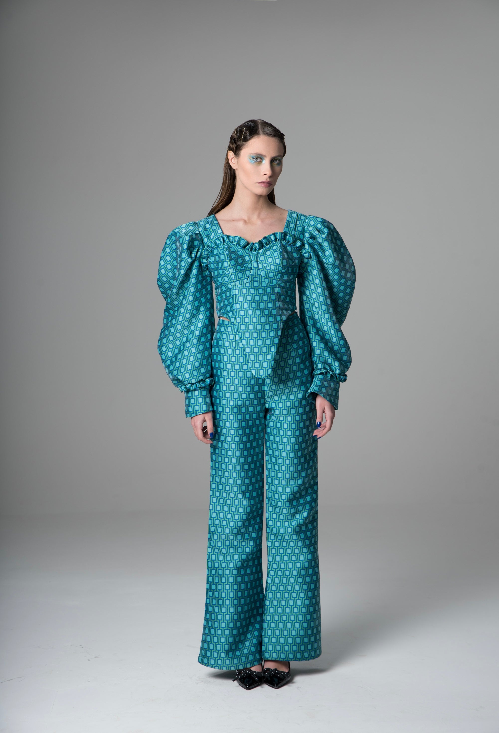 Rube Pants with a high-waist fit and flared legs, designed with a dynamic, artistic print. Vibrant hues create a bold fashion statement, while the flattering silhouette ensures you stand out. Model wears size S (84/68/92)