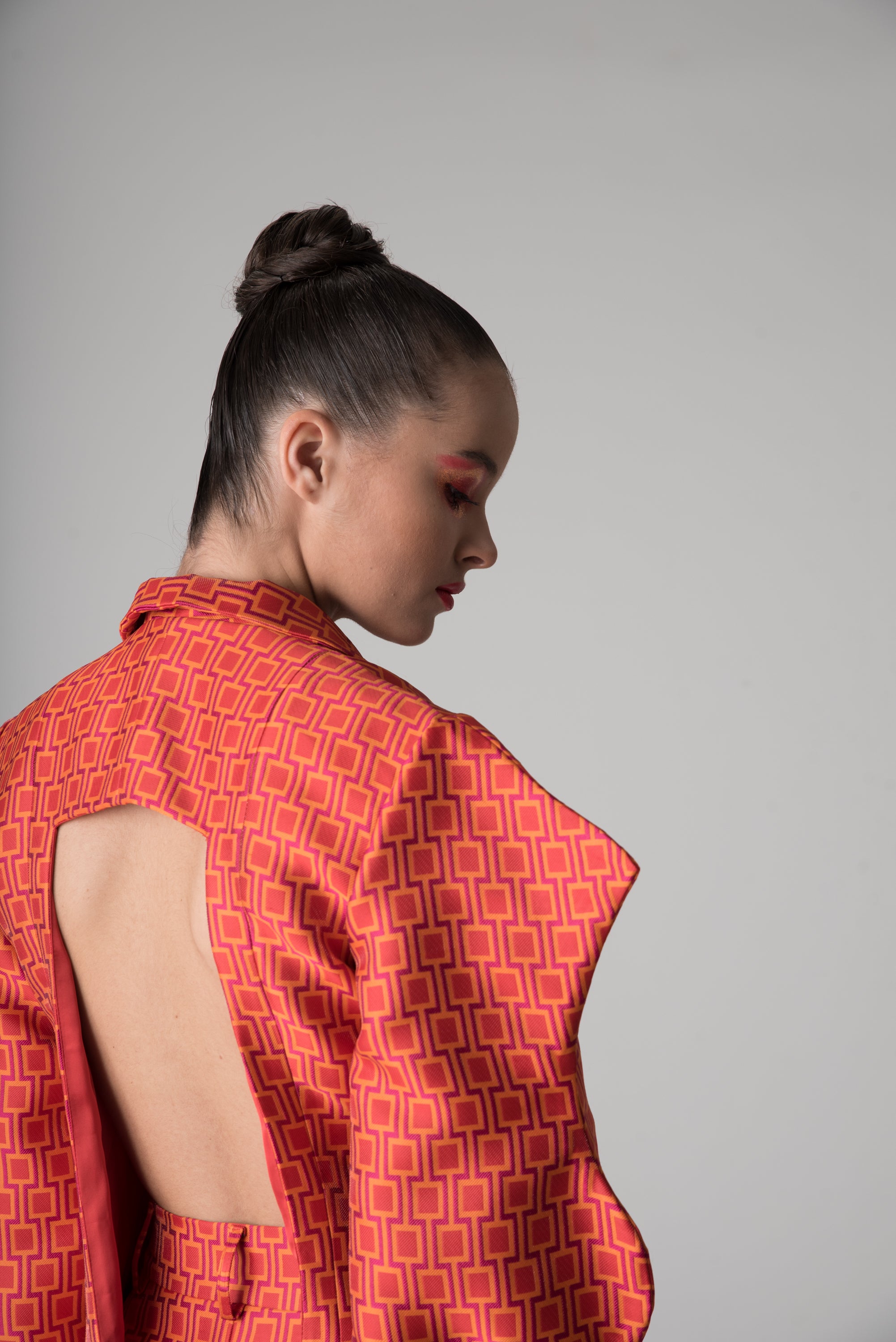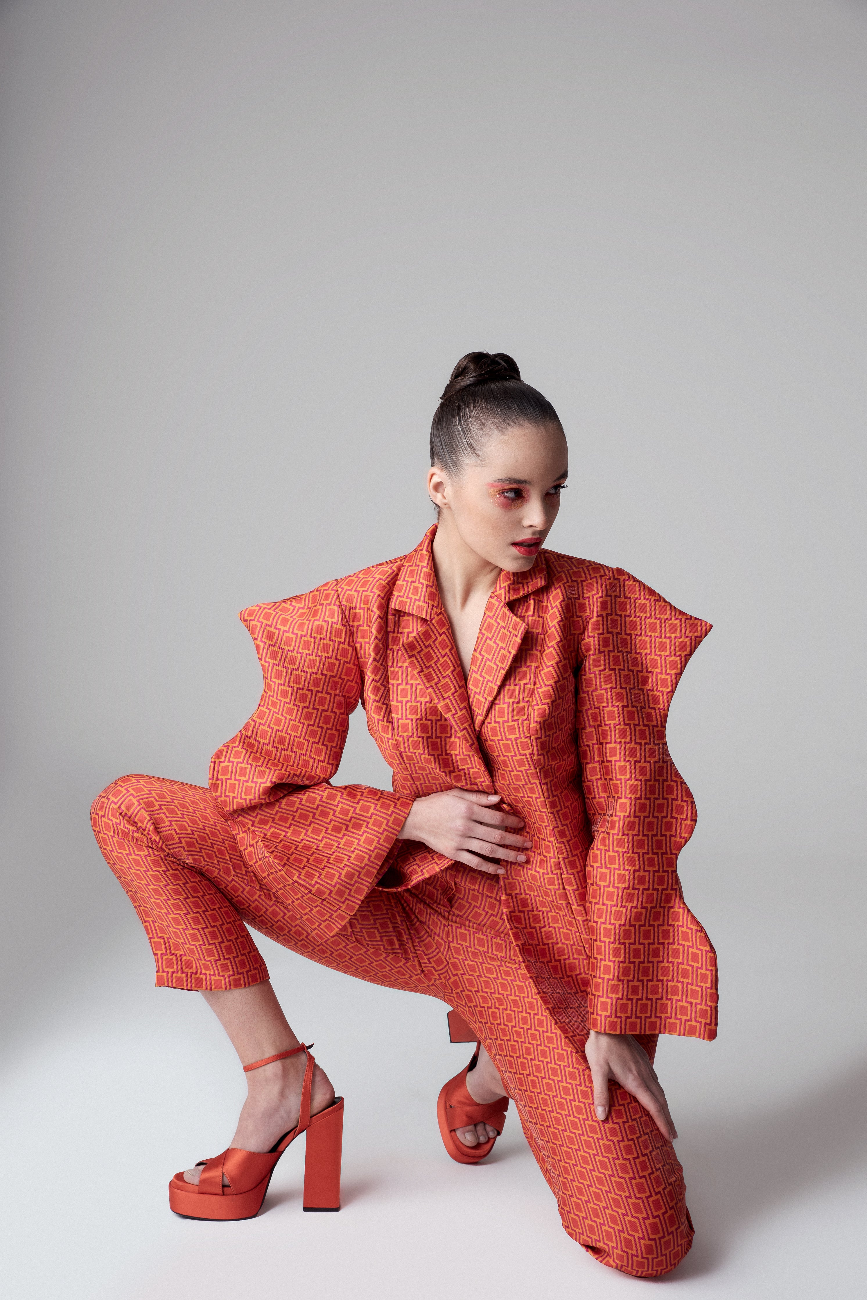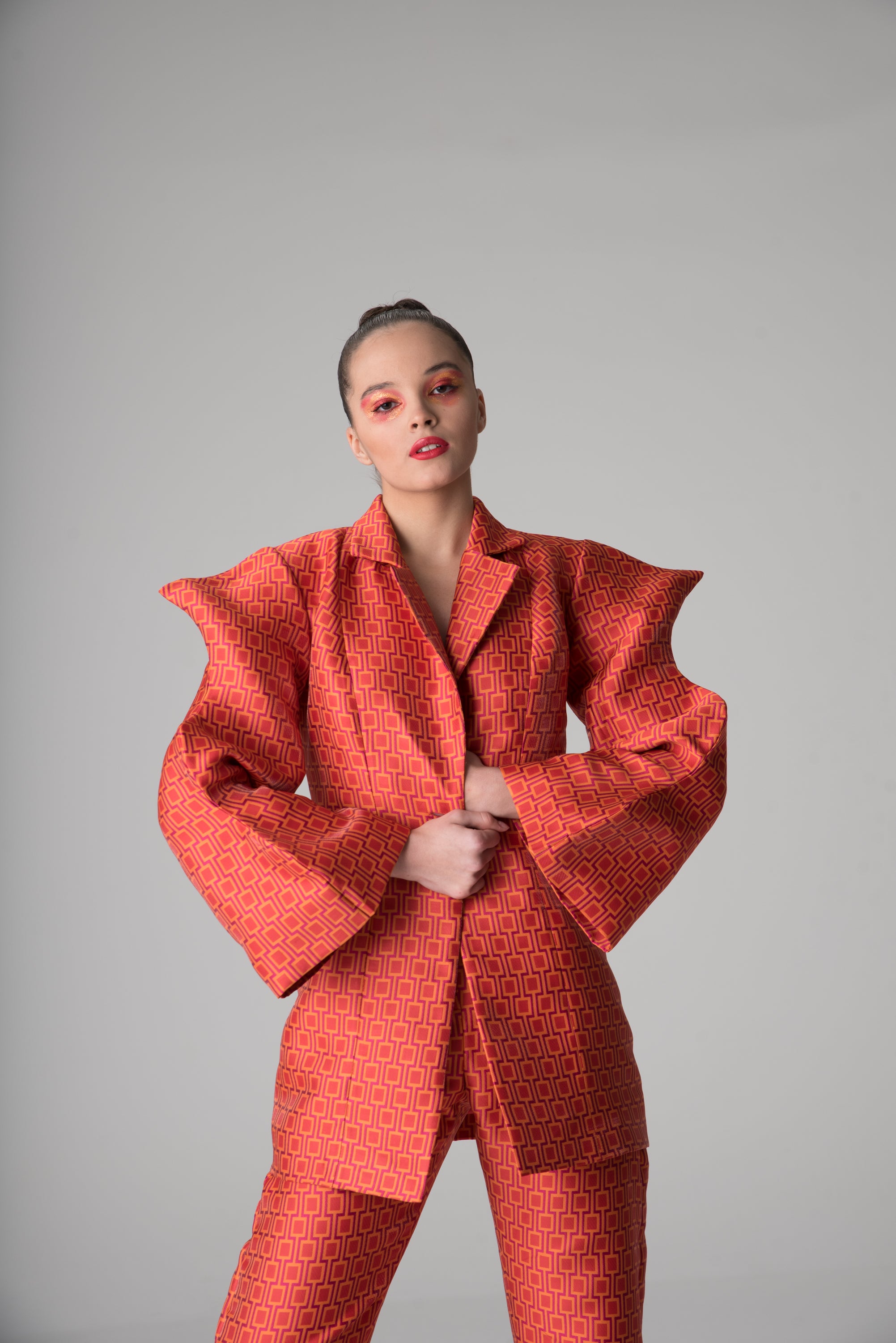 Make a bold statement with our Geometric Statement Jacket. Featuring a vibrant orange and red geometric pattern, exaggerated shoulders, and wide bell sleeves, this jacket exudes dramatic flair. The tailored fit enhances the silhouette, while a unique cutout detail at the back adds an edgy touch. A standout piece for any wardrobe. Model wears size S (84/68/92).