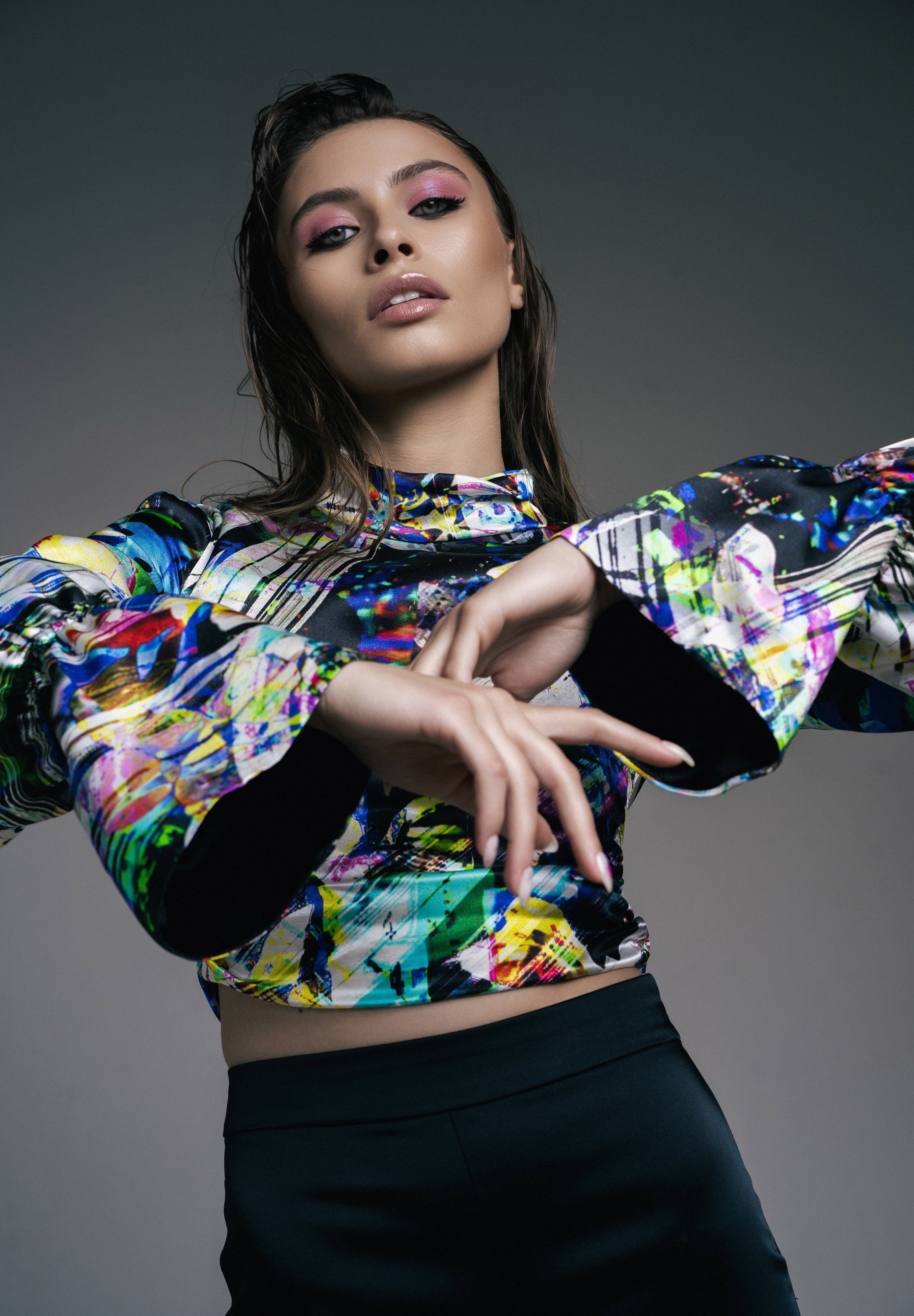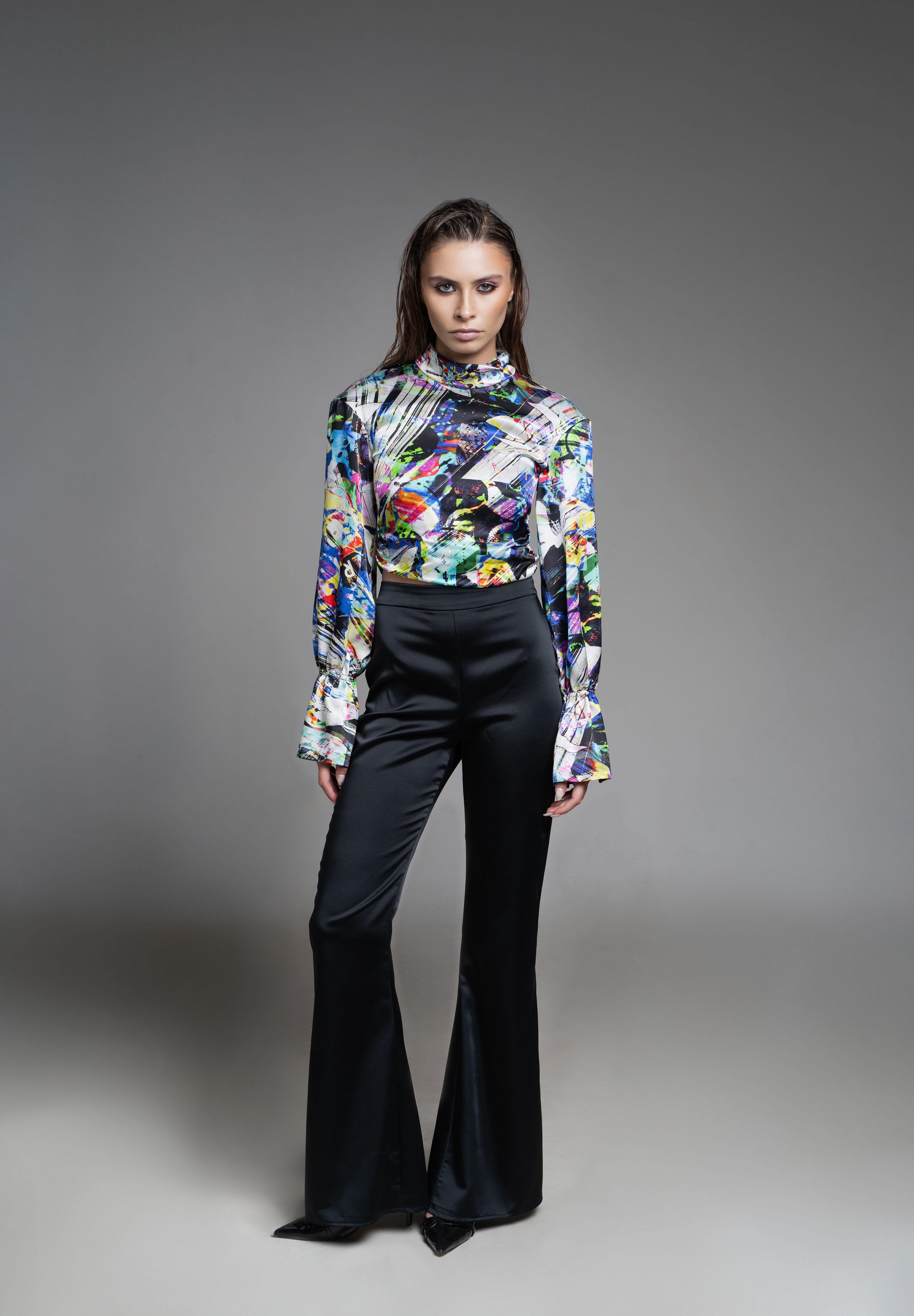 Psyche Blouse with a dynamic blend of colours and abstract patterns. High neck and flared cuffs add elegance, while the tailored fit ensures a flattering silhouette. Model wears size S (84/68/92)