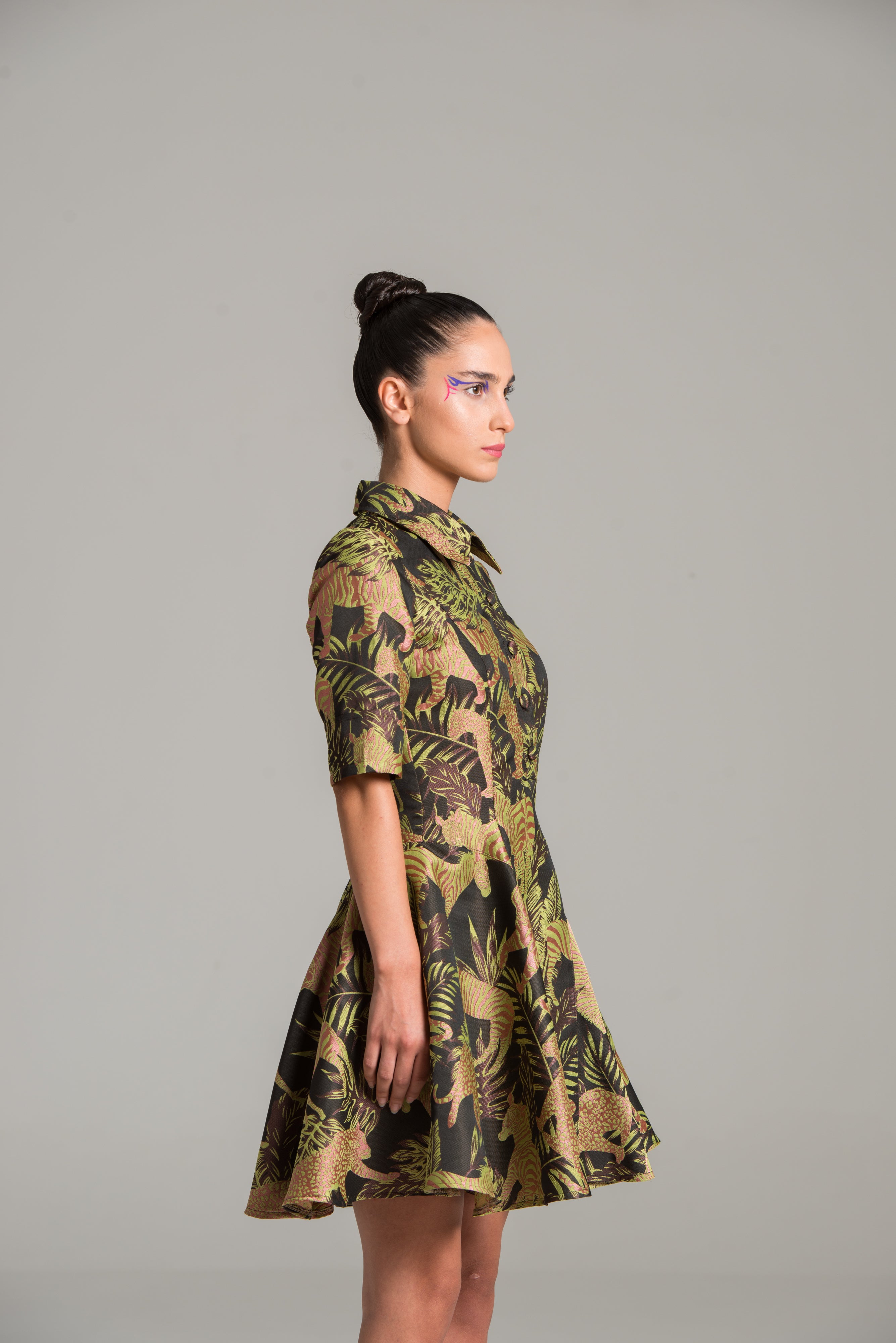 Jungle Inspired Dress with a vibrant, intricate print featuring lush green foliage, leopards, and zebras set against an earthy background. Fitted bodice, classic collared neckline, and short sleeves create a polished look. Defined waistline flows into a flared A-line skirt for movement and grace. Model wears size S (84/68/92).