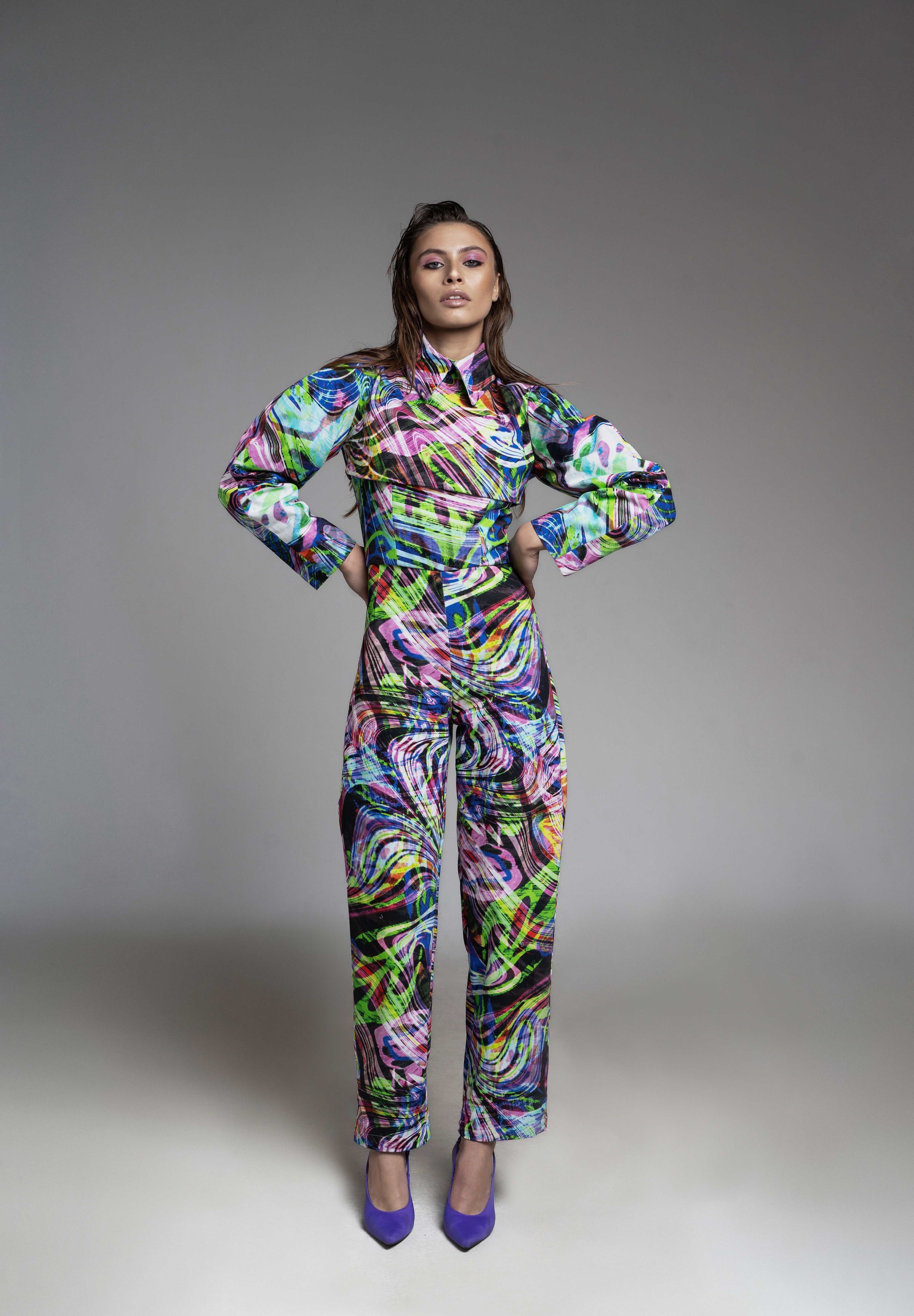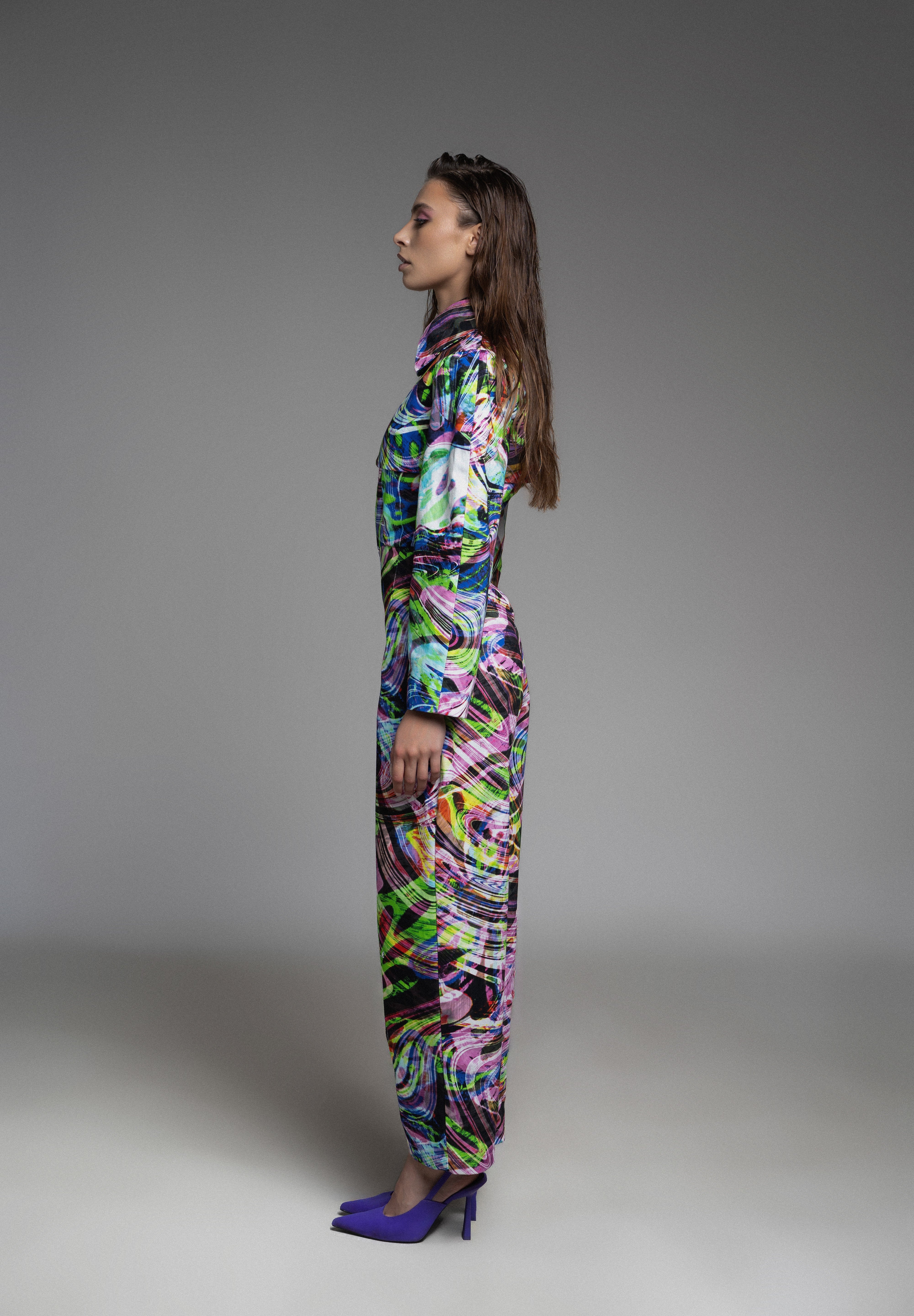 Roza Jumpsuit featuring a vibrant, multicoloured abstract pattern with swirling lines and shapes in a spectrum of colours. High collar and long sleeves create a sleek, modern silhouette. Bold and eye-catching design for a statement look. Model wears size S (84/68/92).