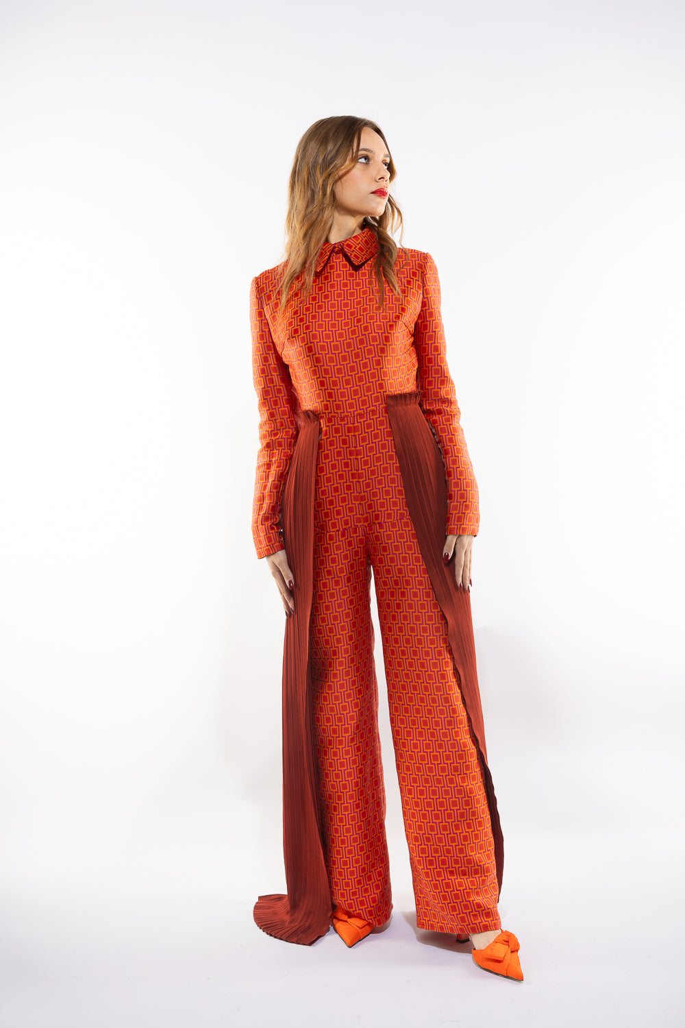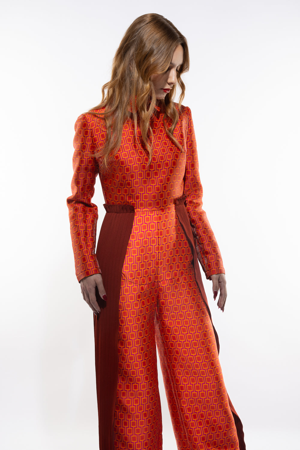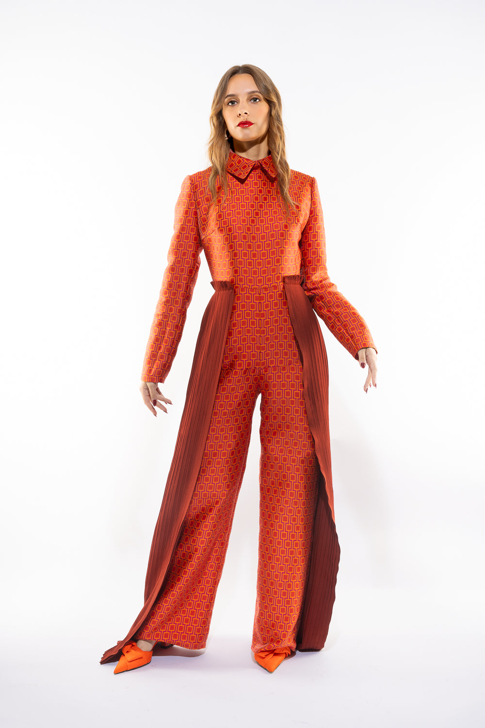 Vibrant Geometric Jumpsuit with a structured collar, long sleeves, and pleated side panels. The wide-leg silhouette combines sophistication with unique flair. Model wears size S (84/68/92).